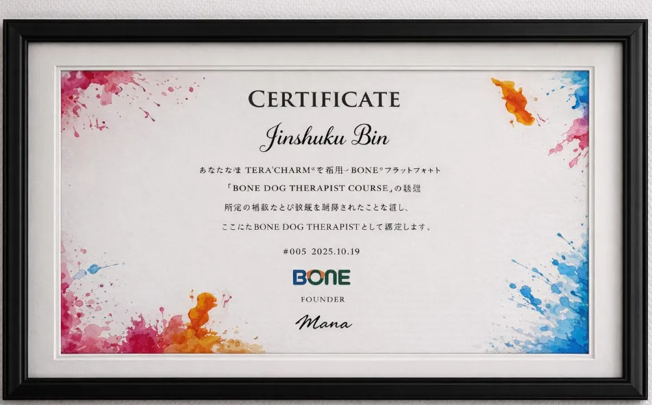 犬の整体施術・講習を行うBONE(ビーワン)認定のドッグセラピストの資格を所持しております。犬の筋肉や骨の特徴を学んだコンディショニングトレーナーが施術を行います。
